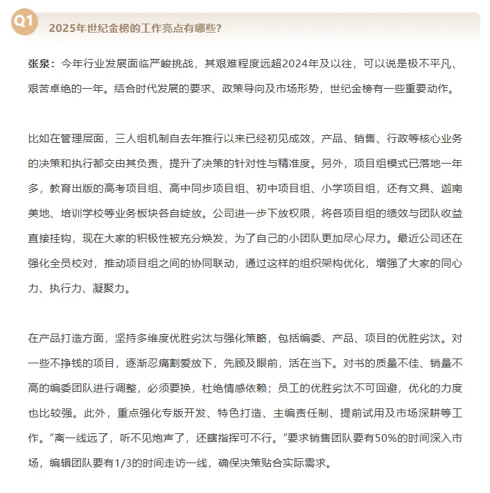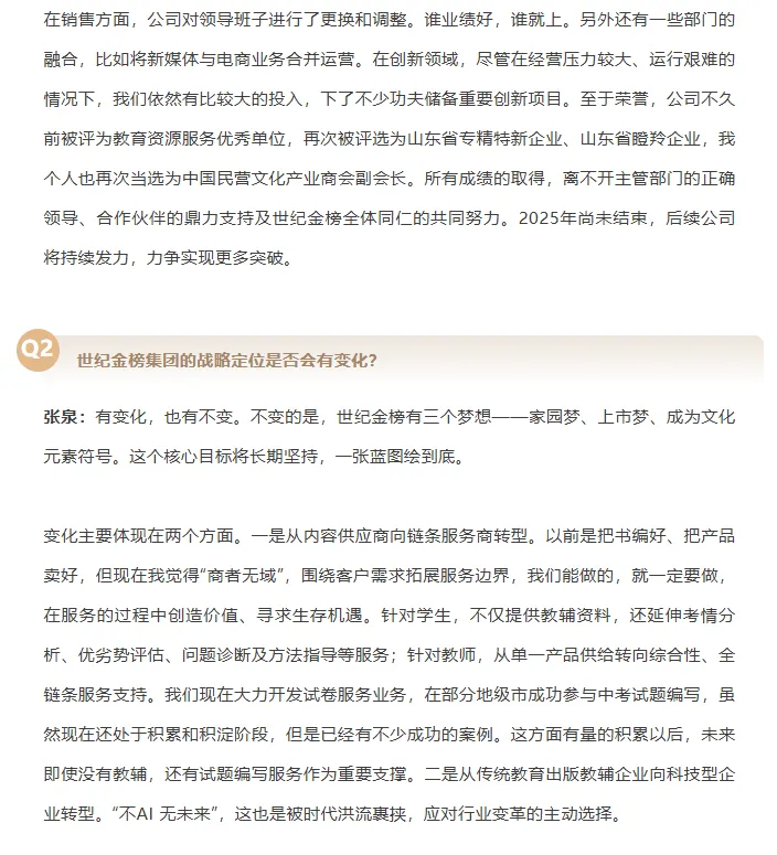 近日,中国出版传媒商报社执行董事(社长)、党委书记、总编辑宋强,围绕行业发展现状、民营书企转型、教辅改革深化、AI技术应用等核心话题,专访世纪金榜集团董事长张泉,分享实践经验与未来构想。